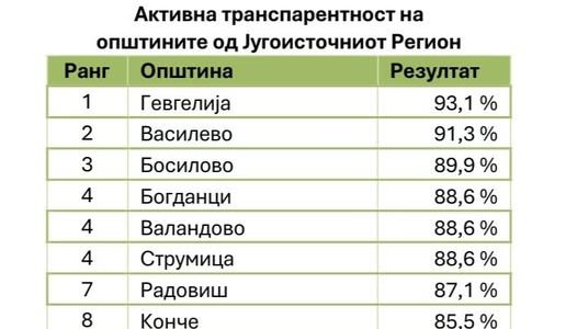 2-ро место во Југоисточниот регион. 24-то место на ниво на државата. Со освоени 91,3%, нашата општина се најде пред многу поголеми општини во Македонија. Тоа е јасен доказ дека не е важна големината, туку посветеноста и чесната работа за граѓаните. Ветивме транспарентна општина и тоа ветување го исполнуваме. Продолжуваме со уште подобри резултати за Василево!“, стои во ФБ објавата на градаоначалникот на општин Василево, Славе Андонов, https://www.facebook.com/vasilevo24, во врска со податоците објавени од страна на Центарот за граѓански комуникации, https://www.ccc.org.mk/, а кои се однесуваат на годишното рангирање на институциите според индексот на активна транспарентност, https://www.ccc.org.mk/images/aktivna%20transparentnost%202025f.pdf.