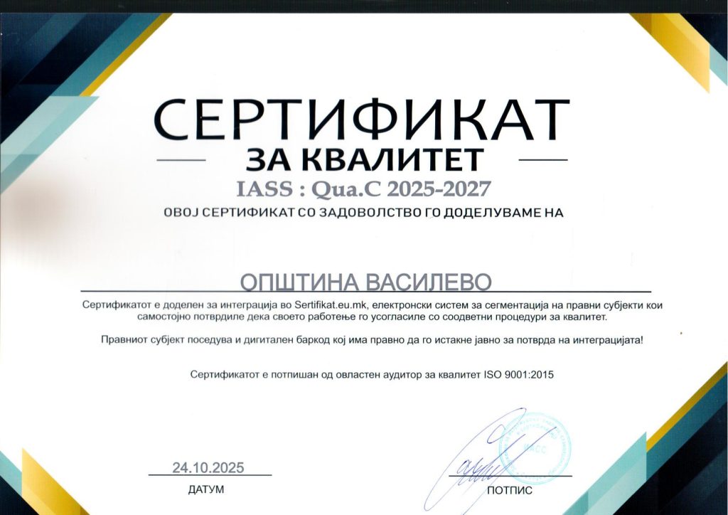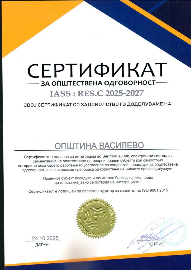 Здружението за истражување, анализа, стандардизација и сертификација ИАСС Скопје, на општина Вaсилево и издаде Уверение за стекнат Сертификат за квалитет IASS: QUA.C 2025 – 2027 и Уверение за стекнат Сертификат за општествена одговорност IASS: RES.C 2025:2027. Како што стои во овие документи Сертификатите се потврда за општествената одговорност, грижата за вработените, грижата за околината, филантропијата, посветеноста за напредокот на заедницата, односот кон граѓаните и позитивниот пристап во соработката со сите партнери.