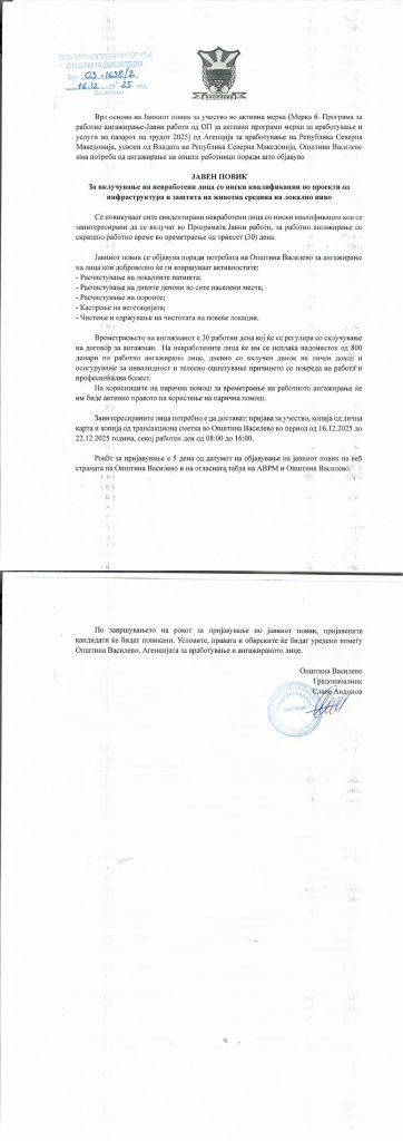 Општина Василево објавува Јавен повик за невработени лица со ниски квалификации за работно ангажирање во проекти од областа на инфраструктурата и заштитата на животната средина на локално ниво. Лицата треба да бидат евидентирани во Агенцијата за вработување.
